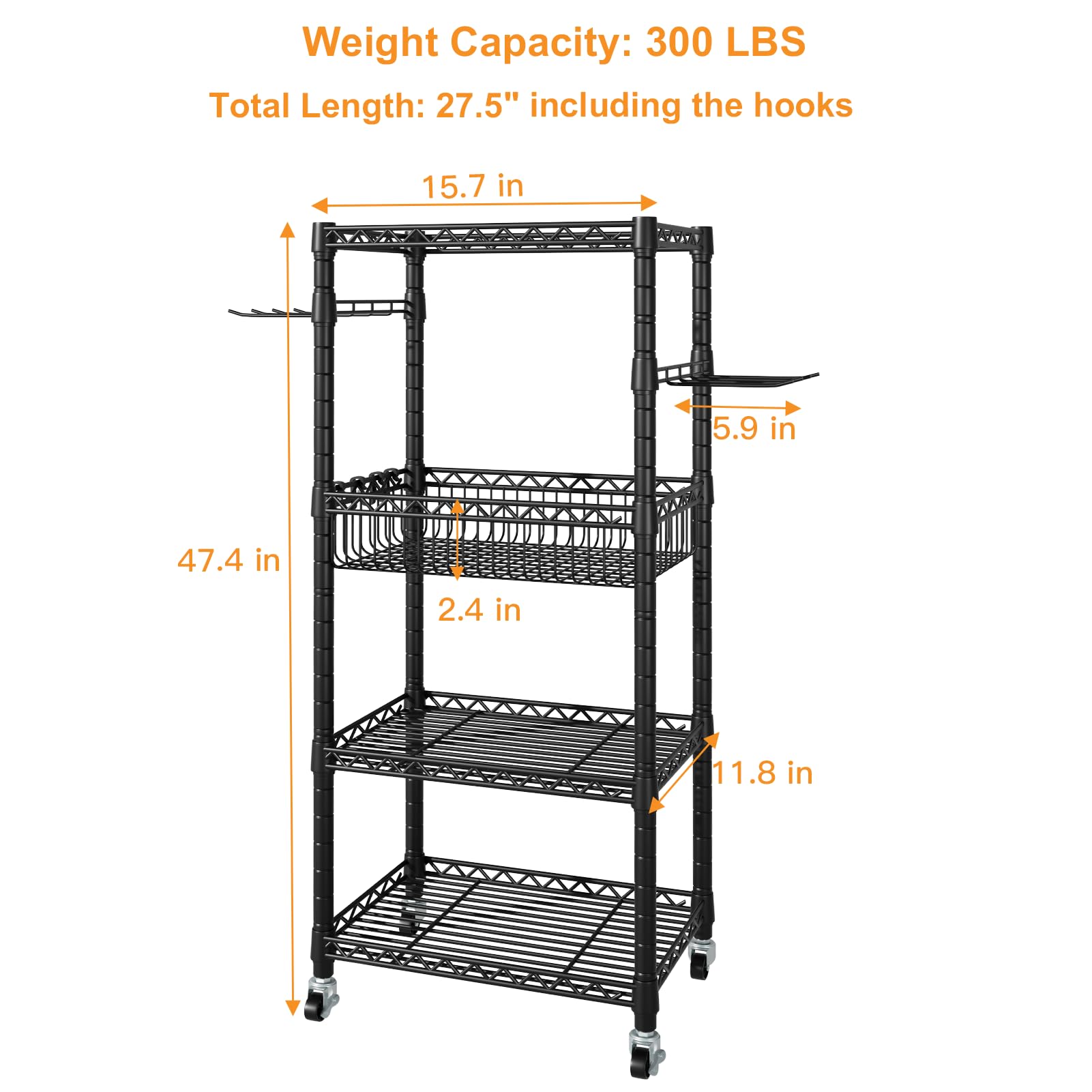 - [Dimension]: The main body size is 47.4"H x 15.7"W x 11.8"D. and the exercise equipment storage rack total length can reach 27.5 inches after you assemble the hooks on the 2 sides