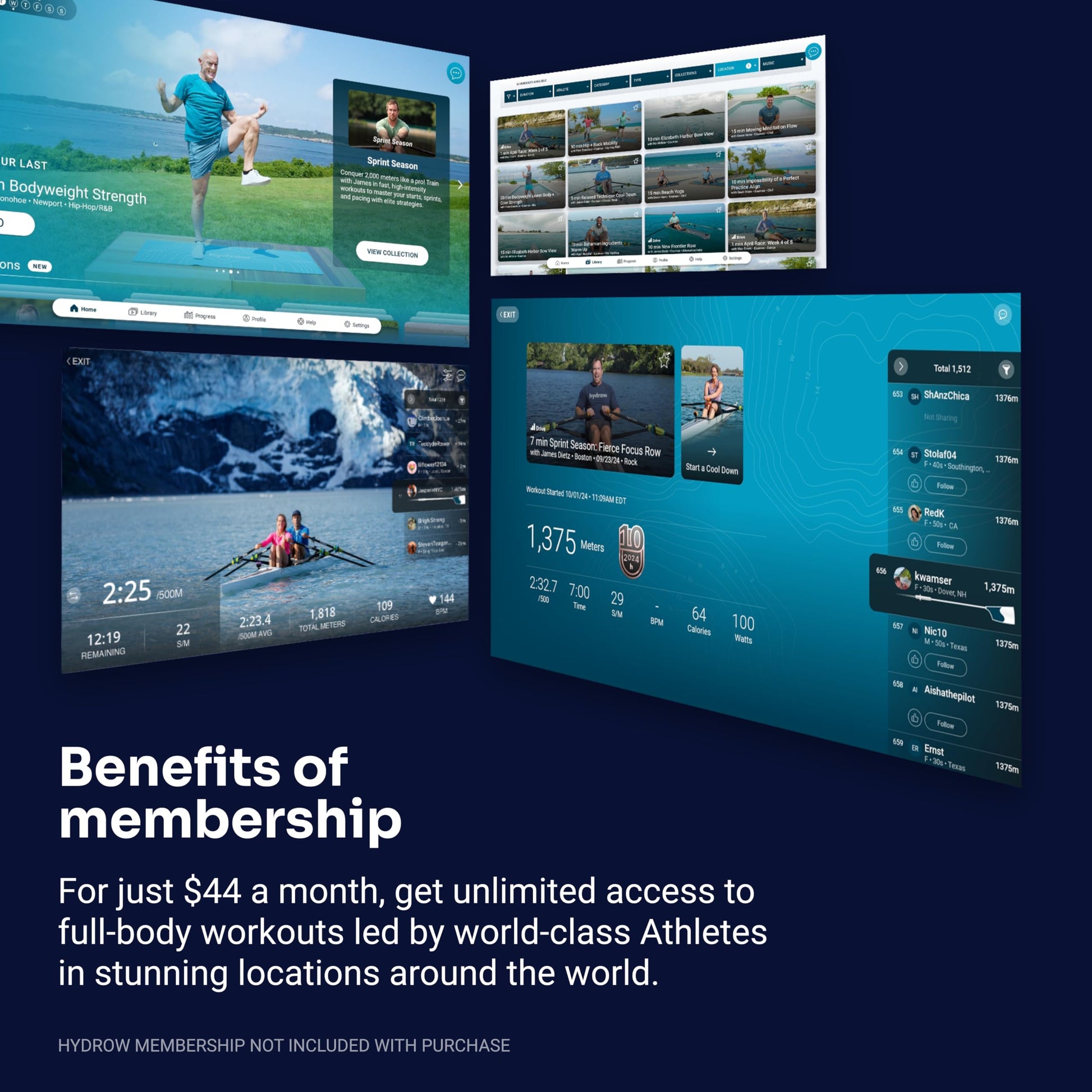- GET A MEMBERSHIP, THEN GET STARTED. For just $44/month, unlock over 5,000 at-home workouts for all fitness levels. Explore a range of workout styles, including cardio, strength, recovery, and more — all led by world-class instructors in stunning locations around the world. (NOTE: Memberships are sold separately from Hydrow rowing machines.)