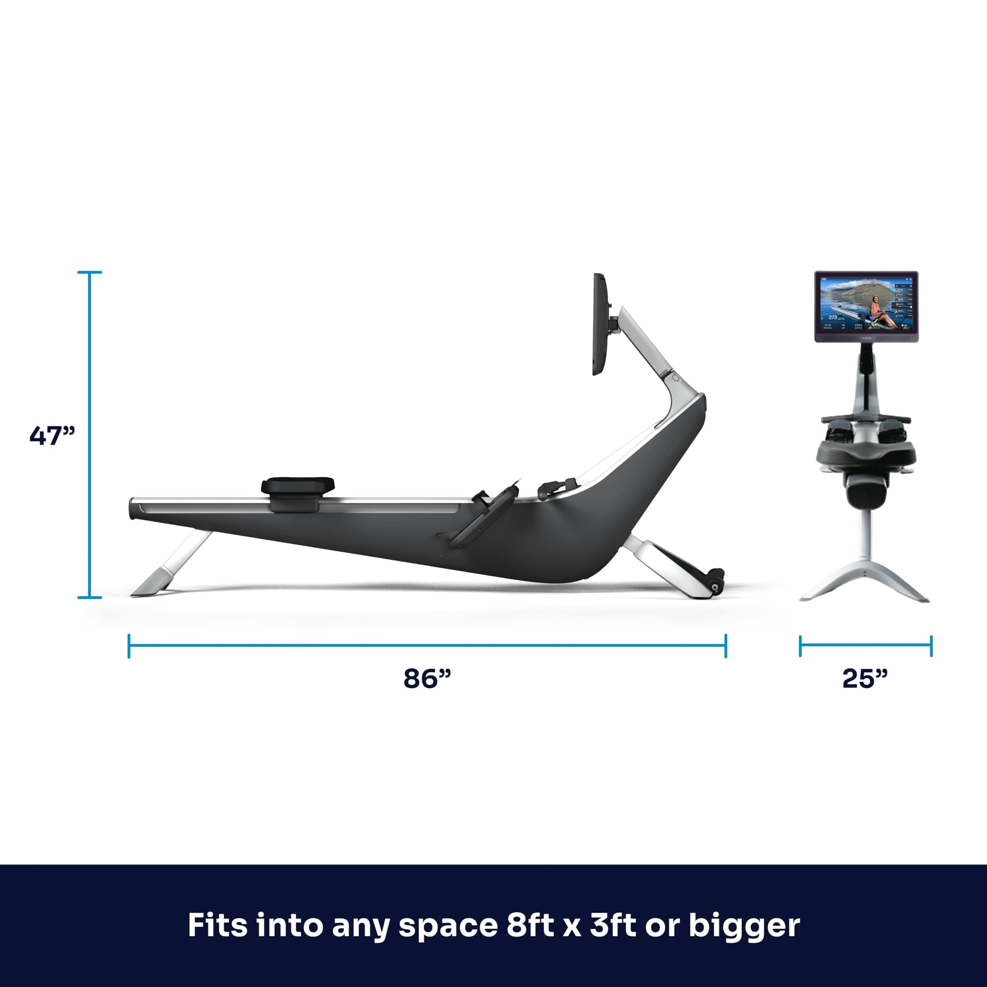 - FITS RIGHT IN AT HOME. This foldable rowing machine can be stored upright using our Upright Storage Kit (sold separately). Dimensions: 86” L x 25” W x 47” H; Weight: 145 lbs; Weight limit up to 375 pounds.