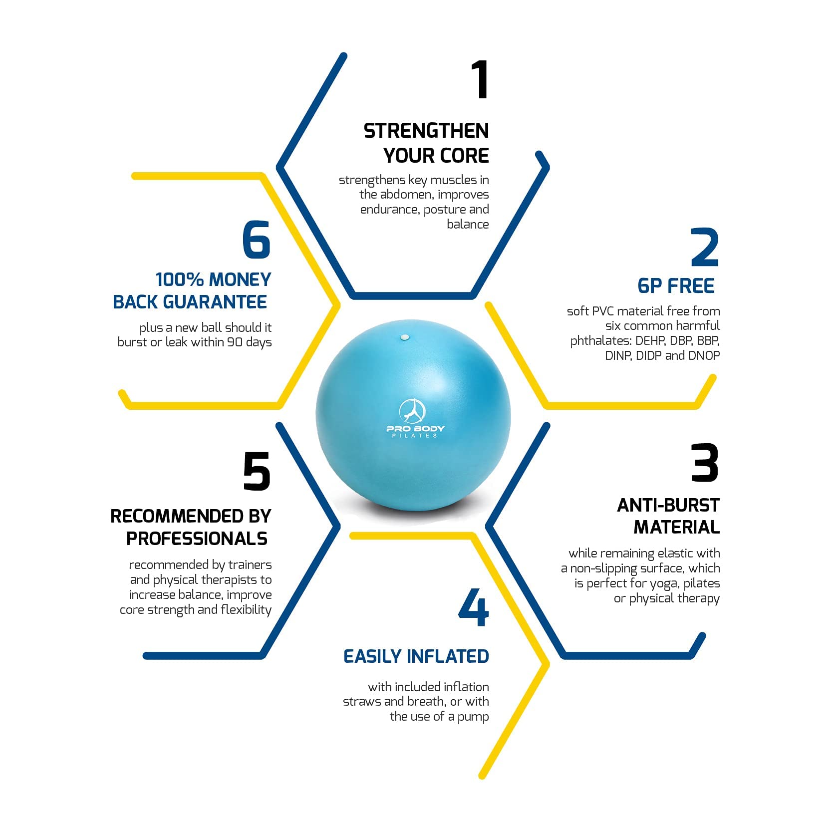 - INCLUDED with our soft Pilates ball are exercises and an extra inflation straw. The 9 inch Pilates ball inflates in seconds, and bringing the small therapy ball on the run is easy.